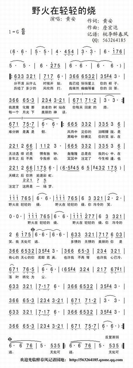 野火在轻轻的烧-黄安(简谱 歌谱 歌曲简谱 合唱简谱 影视简谱)