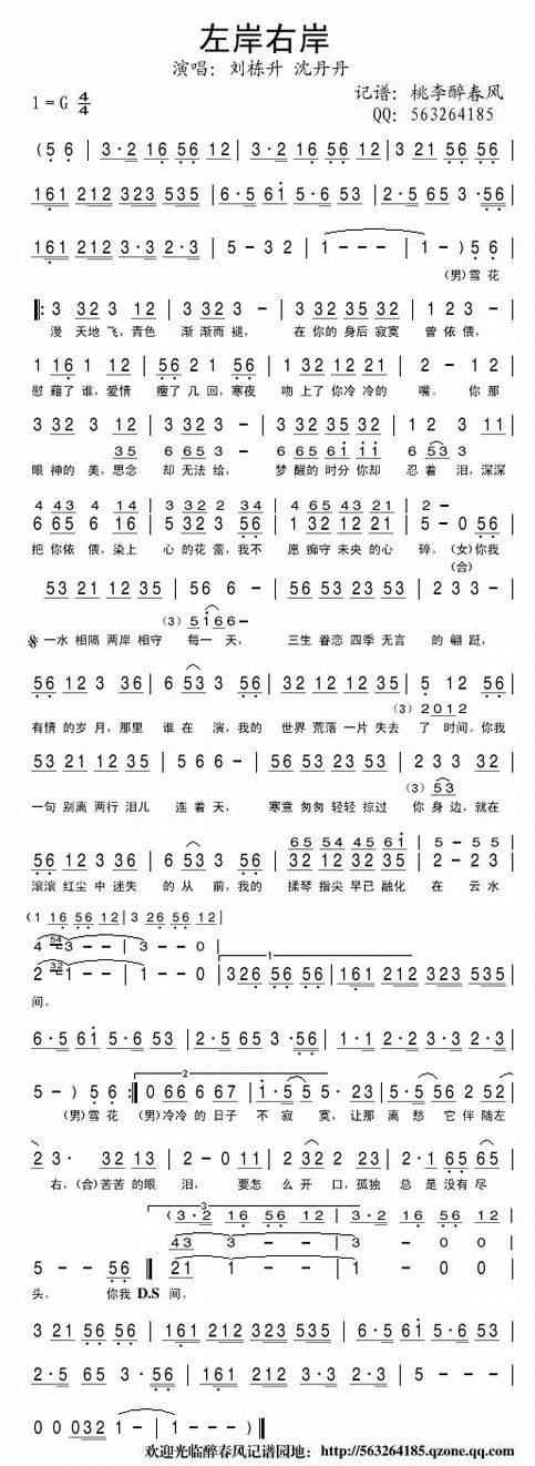 左岸右岸-刘栋升 沈丹丹(简谱 歌谱 歌曲简谱 合唱简谱 影视简谱)