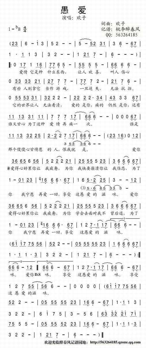 愚爱-欢子(简谱 歌谱 歌曲简谱 合唱简谱 影视简谱)