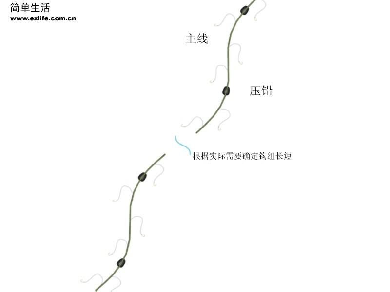 无竿钓法 1﹑钩坠合一:岸钓使用钩坠合一钓组者极少,此钩是一枚长柄大钩,钩柄处浇铸铅水为坠,钩坠合二为一,银光闪亮。钩上无饵食属拟饵钩。根据使用者身高臂长不同,拴钩主线要在1.2米左右处结一螺旋结,并用毛线裹住,以利抛投。使用此钩可钓获鱼种常见的有蓝点马鲛和鲈鱼两种。垂钓时右手持线在体侧或头顶上方做顺时针高速旋转,待力度与角度达到峰值时松手,将钩子投于远处水体中,然后快速捯线,让凶猛贪婪的大鱼追咬钩子。不必因为少有使用者就不屑一顾,抛开鱼种上档次,让人有面子不谈,尾重几千克的蓝点马鲛或鲈鱼不仅能圆搏大鱼的梦想,还会让钓手充分领略其凶悍狂暴所带来的刺激感。请参阅(图(4))。