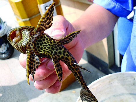 这位姓蔡的钓友告诉记者,昨天早晨6点不到,他就来到南门江边垂钓。7点左右,当他拉起鱼网往水桶里一倒,却发现鲫鱼丛中竟冒出了这样一条怪模怪样的鱼。当时,蔡先生以为是自己孤陋寡闻,才不认识这鱼,于是没多想就拎着水桶去菜市场卖鱼了。