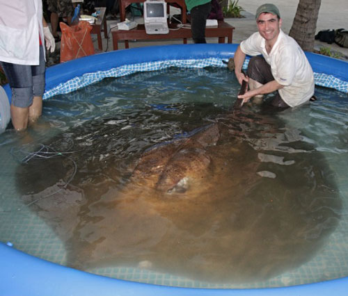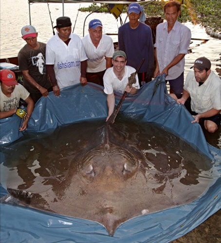 捕获这条鱼的是淡水生物学者伊恩·韦尔奇和他的同事,他们是在泰国西部夜功河钓到的,这条鱼为雌性的淡水魟鱼,它上岸后,经过他们的测量发现,这条鱼居然重达到了350公斤,身体长宽各大约2米,尾部也长约3米。可以想像它的“大”。