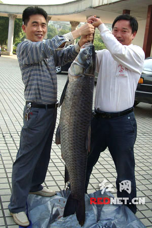 付资云(右1)与局长彭卫东吃力地抬起62斤的大青鱼