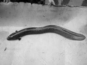 台州日报讯 在昨日,有村民来向记者报料,称在三门县浬浦镇仙岩村有人捕到了一条大的野生河鳗。叫记者过去看看。
