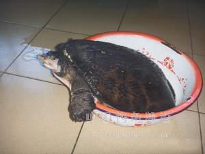 记者赶到高老伯家中,看到了那只大甲鱼。真是一个在家伙呀。高老伯告诉记者:“我平时没事做的时候就喜欢去垂钓,在前天中午11时许,我叫上了朋友一起去了离自家不远的会昌湖垂钓。我当时看到了水面上浮起了一个小脑袋,不知道是什么东西,我就用鱼钩去钓它,它上钩后我却提不上来,又用了渔网兜也还是没有上来。最后叫来了钓友们一起帮忙,折腾了半天,捞起了一个黑家伙。仔细一看竟是一只大甲鱼,足足有一个脸盆那么大”。