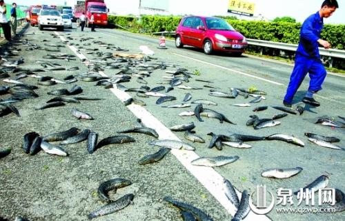记者在沈海高速公路B道(福州往泉州方向)惠安黄塘入口处不远,看到了一辆皖KB5081大货车侧翻,而路面上倾泻了一条条不断扑腾的黑鱼,在中间的一段约8米长的隔离栏被撞裂。货车上的3人手忙脚乱将散落的鱼收拾起来,这才腾出路面让后面的车辆顺利通行。