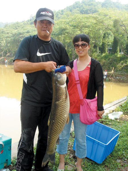 赵亮和妻子钓到“鱼王”后兴奋我照相留念