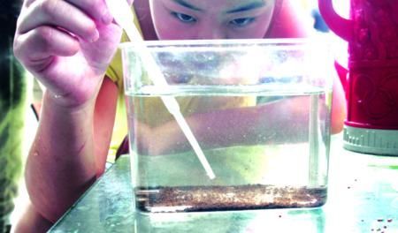 “魔法鱼”果真这么神奇吗?记者为了了解此事,昨天来到了福州市一家卖观赏鱼店里,找到了这种神秘的小鱼。听说我们要找魔法鱼,只见店员拿出了一个纸盒。鱼也能装在纸盒里面卖?对于我们的不解,店员把纸盒里的“魔土”放到水中,只见瓶子的底部有一层薄薄的泥土,只见她用吸管在水里轻轻的搅拌了下,就看到有几条很小的灰色鱼儿游了出来,它们的长度都不到一厘米。