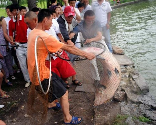 记者赶到了现场,看到了那条大鱼,有三四个的力量才把它给拉上来,现场围了很多的市民。我市垂钓爱好者吴先生与张先生两人在云龙湖西湖北岸垂钓时,当时鱼竿首节都被拽入水中去,才突然意识到有大鱼来咬钩了,当时将鱼竿提起时发现提不动,就像鱼钩挂在湖底的石头上一样,根本就动不了,不敢有丝毫的松劲,他们知道,大鱼的嘴唇特别厚实,如果不使劲猛提,鱼钩很难完全钩住鱼唇,一旦松劲,这种大鱼极容易脱钩。他们当时跟大鱼真是所谓的拼了,借助几个人的力量才把它给拉上岸边,最后用网抄。后来才知道这是一条螺蛳青鱼大鱼,称下不得了,居然重达到了150斤。