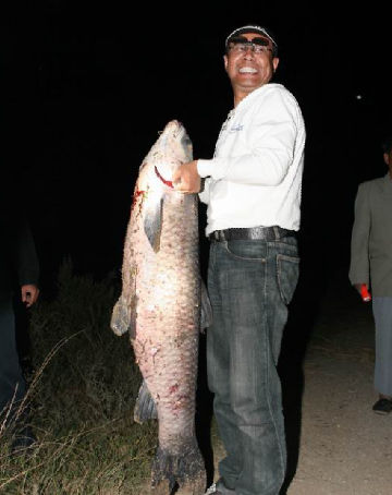顾鸿先生告诉记者,他和朋友来到这个水库垂钓,挂钩后就投入水里,过了半个小时才见有鱼讯,当时我一拉,感觉到拉不动,心想这一定是条大鱼,可是最终让它给跑了。他就再挂钩再钓,等到天黑了都没见大鱼露头,等到8时许的时候又见鱼上钩,他这次非常的小心,和鱼博斗了1个多小时,最后鱼才出水斩获!顾鸿先生说他是第一次钓到这么大的鱼,非常的兴奋,他将把鱼带回家做成一顿大餐。