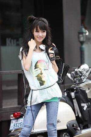 点评:背心层叠穿着可爱俏皮,搭配黑色破洞牛仔裤,帅气十足。