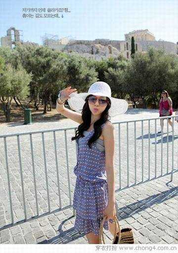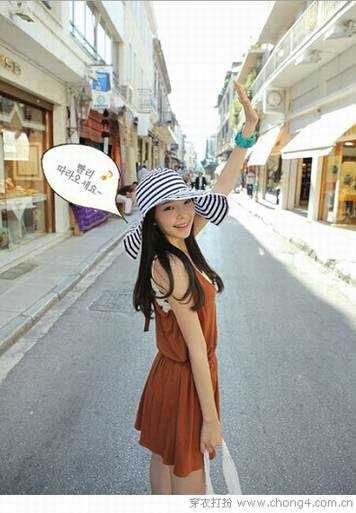 背心搭配短裙的可爱装扮,戴上草帽更显俏丽。