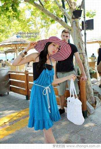 条文草帽搭配蓝色可爱连衣裙,时尚少女的夏日搭配。