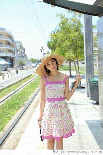 超有夏天气氛的粉色草帽,搭配花色花朵图案连衣裙,可爱度十足。
