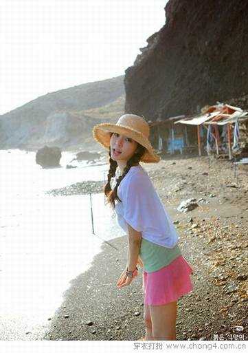 粉藕色上衣可爱甜美,搭配白色草帽,清爽宜人。
