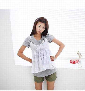 时尚点评:灰色的卡通T恤舒适宜人,叠穿纱质的吊带小背心,娇媚可爱的样子就出来啦!绿色的短裤能衬托腿型。