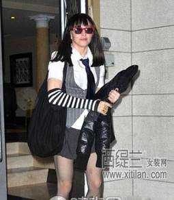 点评一:看到麦当娜(Madonna))这样的天王天后这样的装扮, 是不是又回到了学生时代呢?红色的眼境边框,休闲的学生装扮,黑色的包包.休闲的鞋子. 黑白灰始终不变,是明星着装的主选颜色.