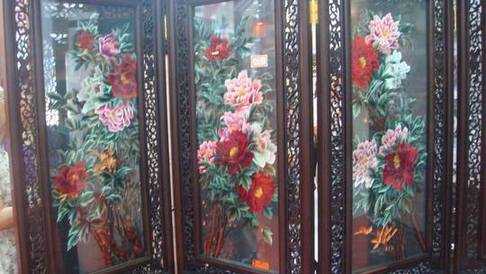 这个屏风很大气吧,上面的牡丹是绣上去的,我特别喜欢那个深红色的牡丹,跟火一样,可想而知,售价也不可小看哦,标价28万!