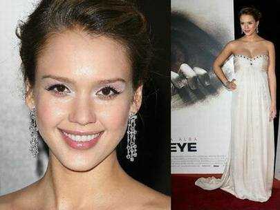 身着白色长裙的杰西卡,华丽的钻石耳坠让人忍不住把视线停留在她玫瑰色的脸庞上,你知道小编突然觉得怀孕的女士脸上总是闪耀着母性的光辉,即使是钻石的璀璨光芒也遮着不住呢。