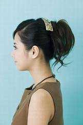 ↑将脸颊两侧头发别在耳后,再将上面的头发盖下,使头发显得厚实。