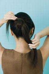 3.最后将马尾的发束,以不规则的方式缠绕后用发圈将其固定,即能展现自然动人的不造作发型。