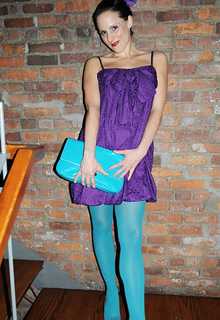 紫色蝴蝶吊带裙搭配湖蓝色鞋,包和配饰。两种对比强烈的颜色效果搭配不错。头上沿用紫色花朵头饰,细心装扮下赴约一定高调精彩。那深深浅浅的紫色,总是惊艳又神秘。
