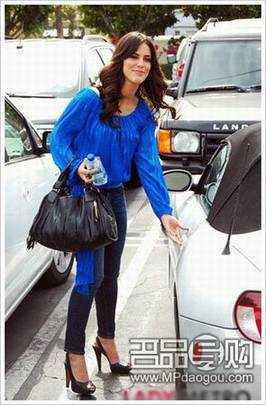 蓝色除了与黄色相配,红蓝色组合,则使人显得妩媚、俏丽,再配以碎花裙,显露出一种自我个性,从而变得明快起来。包与橘红色围巾腰带相呼应则更出彩。