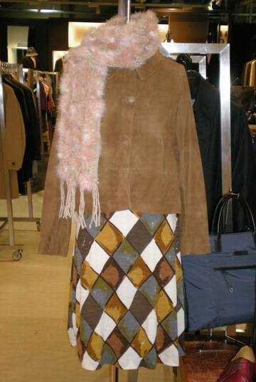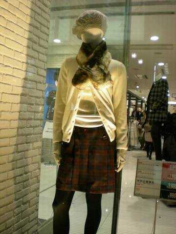 典型的少女型装扮。毛衣、短裙、围巾、手套,