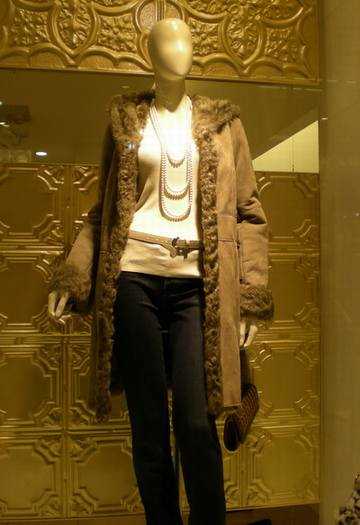 古铜色的大衣,领帽合一的处理,以毛绒做衬里,