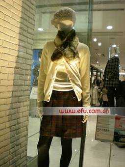 典型的少女型装扮。毛衣、短裙、围巾、手套,被一款时令的小帽加以衬托,洒脱、妩媚。