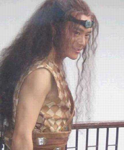 这个造型真是吓死人不偿命了!!脖子显得特细,肩膀特圆厚,服装顏色搭配得简直乱七八糟,额头上大红的一条特像坐月子时扎的那一条!