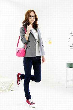 搭配风格:瘦仔裤、小西装外套都是潮女很爱的款式,鞋子与包包的出挑色彩为整身搭配瞬间提亮。