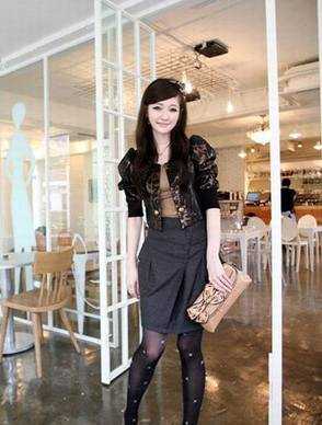 搭配风格:复古垫肩公主袖小外套让整个人都华丽起来,然而包包与圆点丝袜又透露出一点少女的可爱活泼。