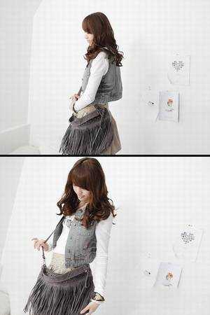 搭配风格:服装的顏色搭配苏丹温暖,牛仔小马甲与流苏包的搭配给人一种自由不羁的感觉。