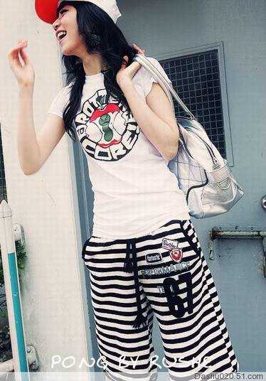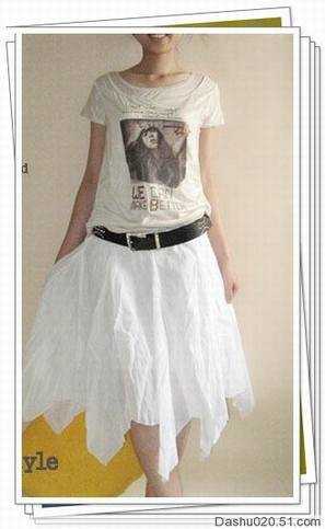 2.上衣可以还是夏天的那件黑色的印花t恤,下装就换上米色的纯棉含莱卡的及膝a字裙,脚上穿着白地彩色条纹的平底休闲鞋子,整个人看起来格外舒适,还充满着阳光的气息。