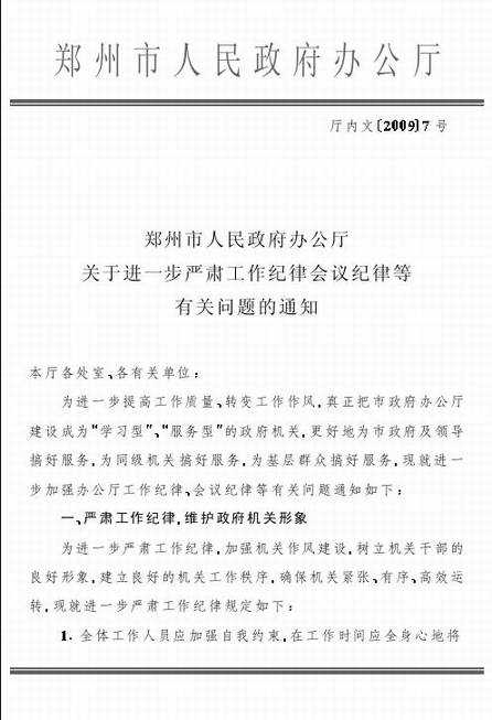 河南省郑州市政府办公厅日前下发了严肃工作和会议纪律的有关规定,要求机关工作人员注意服装的款式、色彩、搭配,不能大红大绿,不可乱穿乱戴。