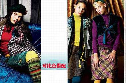 指两个相隔较远的颜色相配,如:黄色与紫色,红色与青绿色,这种配色比较强烈。在进行服饰顏色搭配时应先衡量一下,你是为了突出哪个部分的衣饰。不要把沉着色彩,例如:深褐色、深紫色与黑色搭配,这样会和黑色呈现“抢色”的后果,令整套服装没有重点,而且服装的整体表现也会显得很沉重、昏暗无色。