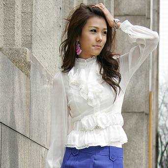 近似黑色的蓝色合体外套,配白衬衣,再系上领结,出席一些正式场合,会使人显得神秘且不失浪漫。曲线鲜明的蓝色外套和及膝的蓝色裙子搭配,再以白衬衣、白袜子、白鞋点缀,会透出一种轻盈的妩媚气息。