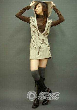 时尚衣服搭配点评:连帽针织衫,帽子与衣服形成整体,胸前的大V字领一直开到胸部以下,既性感又有型,韩都衣舍品牌的服装在编织上很有特色,不规则的线条给人视觉的冲击。65里面的衣长搭配长筒靴,让美眉看起来高挑妩媚。