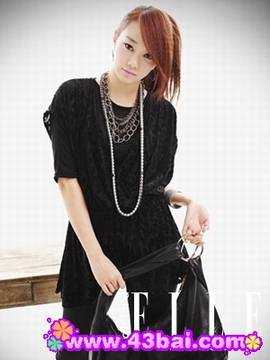 黑色背心、黑色短裤、黑色连身袜、黑色流苏装饰机车包的组合带来淡淡的摇滚味道,而湖蓝色套头针织衫的加入彻底解除了黑色禁锢,用轻摇滚的姿态宣告着少女情怀。