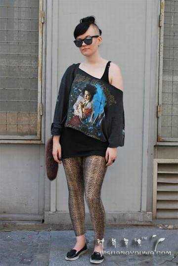 时尚解析:黑色宽松长衫看起来很有女士味,搭配有黑色图案的legging。legging整体色泽较浅,为了避免头重脚轻,脚上的黑色高跟鞋很关键!而下方蛇皮纹legging的街头搭配更加大胆,露肩式上衣可以弥补身材的缺陷,看起来也更潇洒时尚!