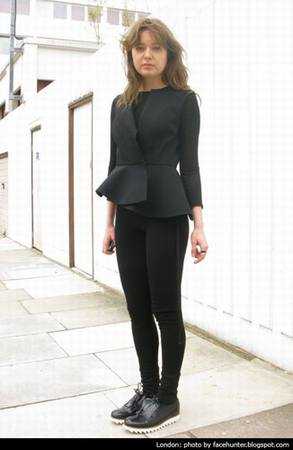时尚服饰搭配点评:这位伦敦美女就比较OL风了。束腰黑色坎肩比较有质感。不过其他元素又都是休闲嬉皮风格。混搭是潮流嘛!