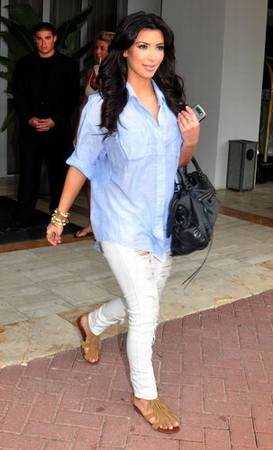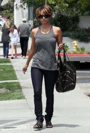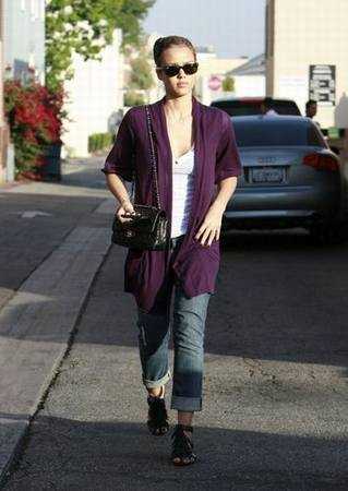 明星点评:灰色背心舒适实用搭配窄腿牛仔裤及皮质流苏凉鞋时尚大方。