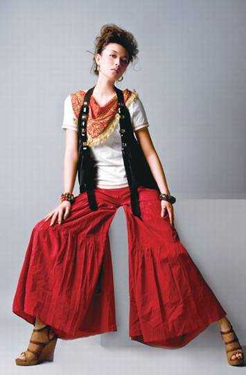 时尚穿着搭配亮点:充满异域风情的围巾让人心驰神往,但是谁能服装厂它却是时下最流行的连t款。搭配挂脖坎肩更是体现出不羁风情。让人热情高涨的高饱和度色彩红色裤装更是服装的点睛之笔,夸张的裤形让人分不清是裙子还是裤子,搭配镂空裹脚高跟鞋,非洲气息更加奔放热烈。