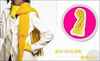 搭配四 橘黄与白色搭配 本季围巾崇尚大胆热烈、明艳活泼的色彩,让你在今季中能够鲜艳出众,“抢夺”众人的目光。