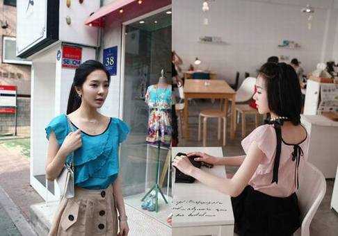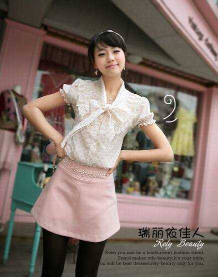 皇冠两件包EMS♀韩国订单~超甜美粉色蕾丝边蝴蝶结花瓣袖衬衣