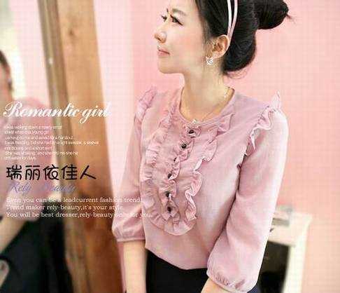 皇冠两件包EMS♀韩国订单~09新款韩版荷叶花瓣粉紫7分袖小衬衫