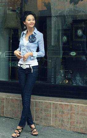 天蓝色的衬衣,配上深色的大花,十分有名媛气质
