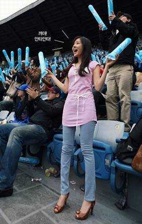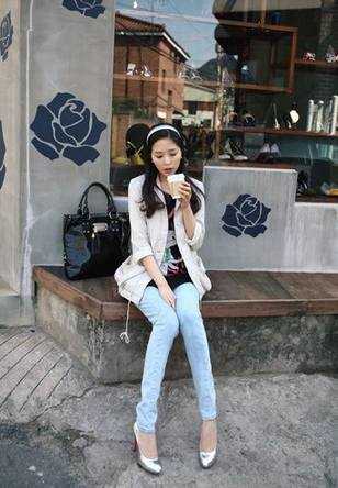 图示:粉红上衣,白色长裤,衬托你的修长娇美