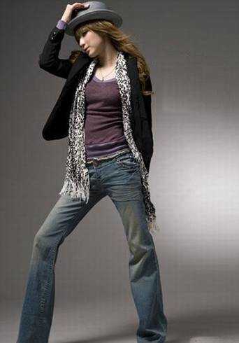 10、紫色T恤搭牛仔裤,黑色短西装外套,配灰色小礼帽和围巾
